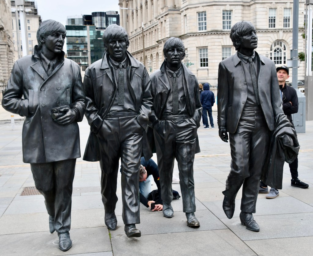 Sculpture, The Beatles Returning from America, taken in Liverpool June 2019 (see 38 and 65 Across)