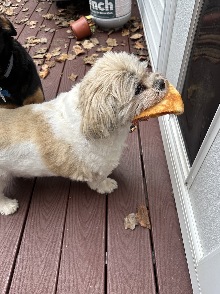Nothing to do with the puzzle – our dog, Mia, trying to get into the house with a slice of pizza she found in a trash bag left by some contractors.